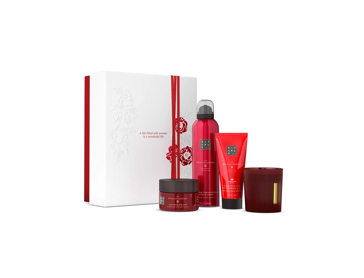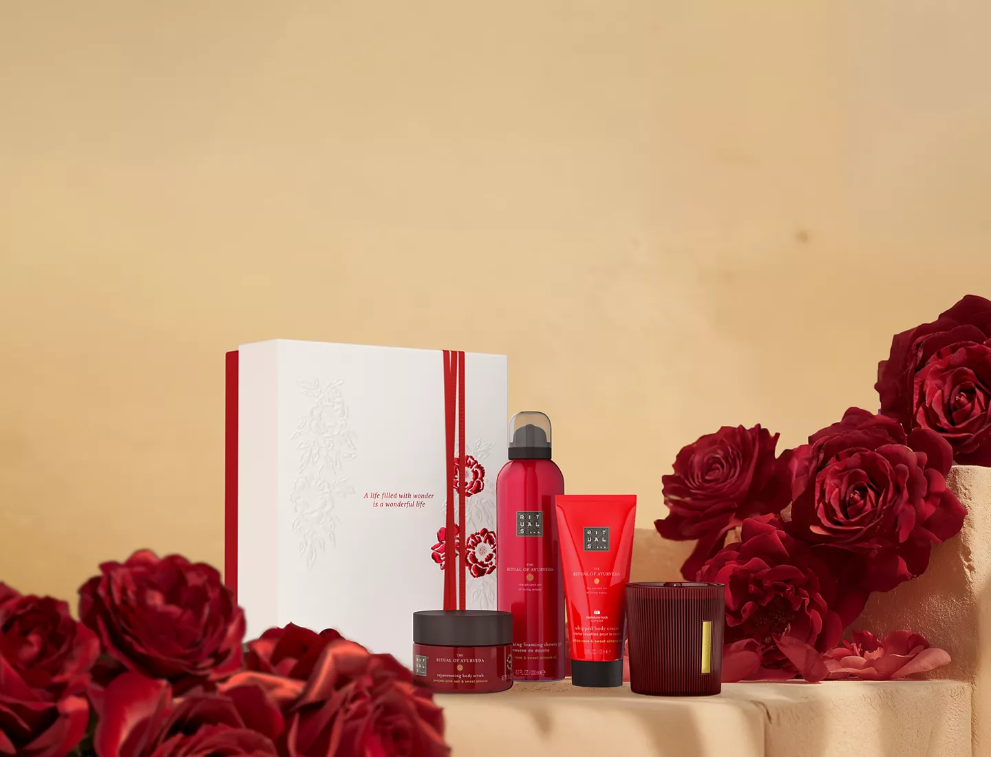 Coffret bien-être parfumé à la rose et à l’amande douce pour un moment de détente et de douceur.